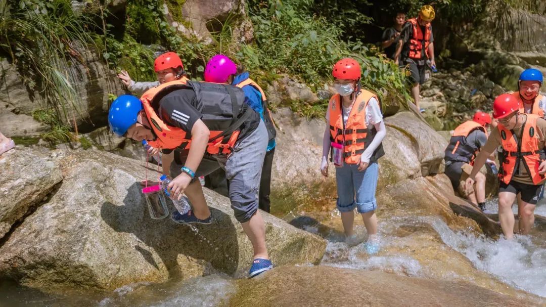 逆流而上的過程考驗著健科小伙伴們的體力和耐力,但沿途也一樣處處充滿著驚喜。水流聲、蟲鳴鳥叫聲、每個人的歡聲笑語,在山林中交織在一起。沒有裝備的人脫下帽子舀水回擊水槍選手,另外一邊四五個大漢排成一列,坐在光滑的石槽中,順著清澈的溪水沖入水池。最刺激的是從四五米高的石頭上跳入水潭,克服內(nèi)心的恐懼,一瞬間的失重感,整個人被清涼的溪水包裹,驚險而又刺激。